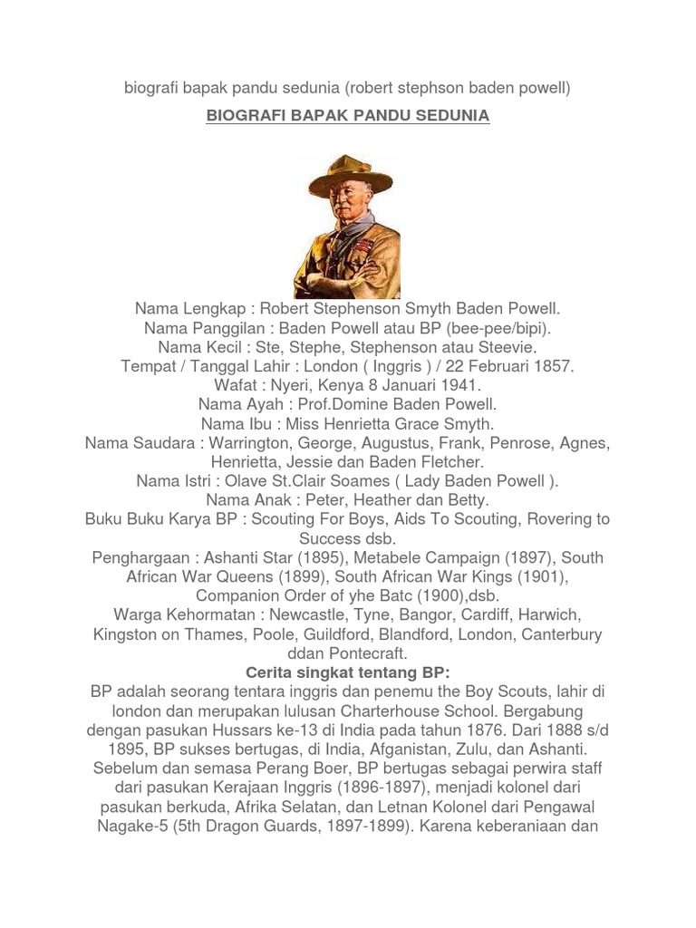 Biografi baden powell lengkap. Tempat Tanggal Lahir. Bergabung dengan Pasukan Husars ke-13 di India pada tahun 1876Dari 1888 sampai 1895 BP sukses bertugas di India Afganistan Zulu dan Ashanti. London Inggris 22 Februari 1857.