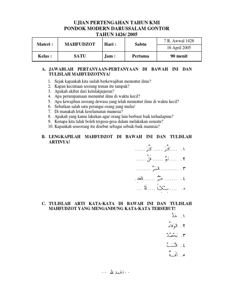Oleh admin Diposting pada 20 Januari 2021. Soal Mahfudzot kelas 1KMI semester 2 A. Oleh admin Diposting pada 20 Januari 2021.