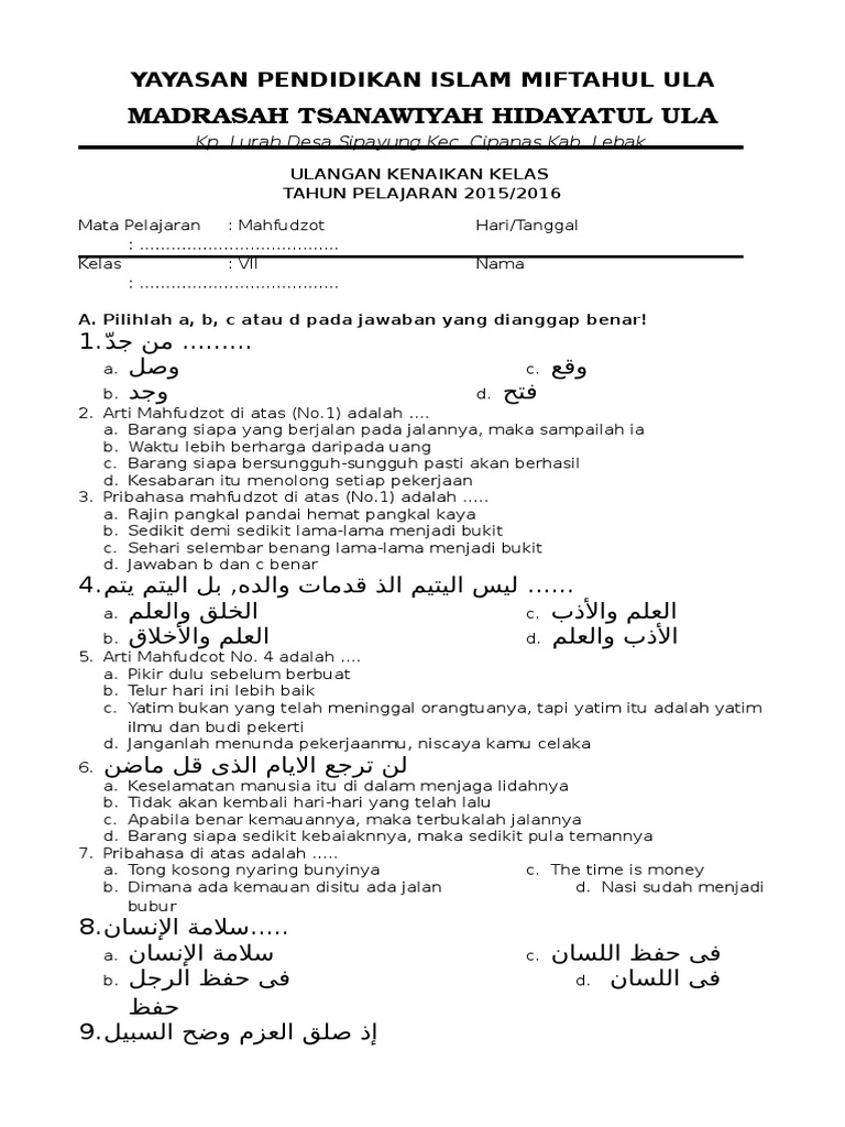 4 01 6 9q ˇ ł a 2 01 2 bgv 8zq ˇ xd6e s bsjvej9ˇ. Soal mutholaah kls 2 int. Mahfudzot Mahfudzot Bahasa Arab sebagai suatu bahasa yang kompleks mencakup beberapa ilmu terapan yang digunakan sebagai perantara pencapaian kebenaran yang mutlak secara lisan dalam pengucapan dan tulisan bahasa arab.